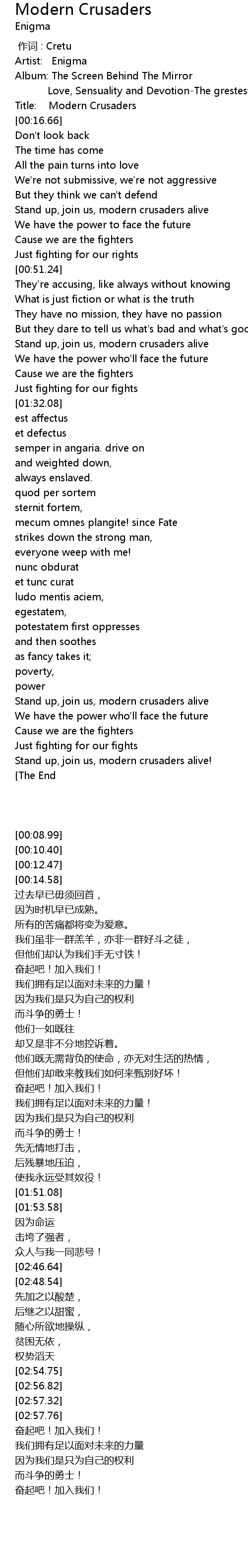 | [00:14.58] | Title: Modern Crusaders |