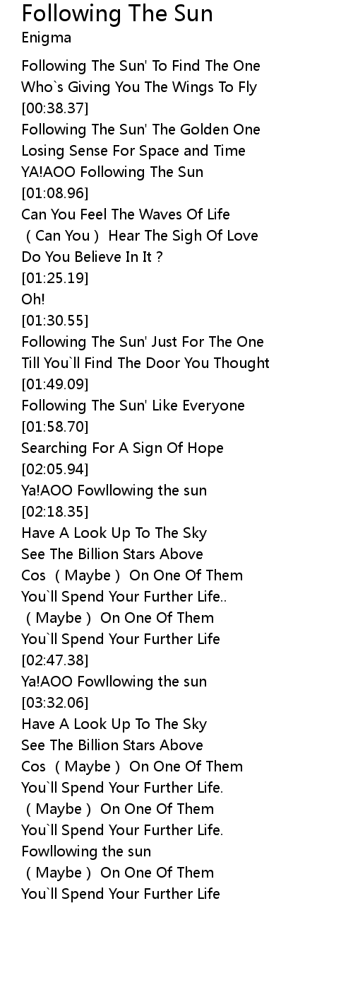 | [03:23.26] | Ya! AOO Fowllowing the sun |