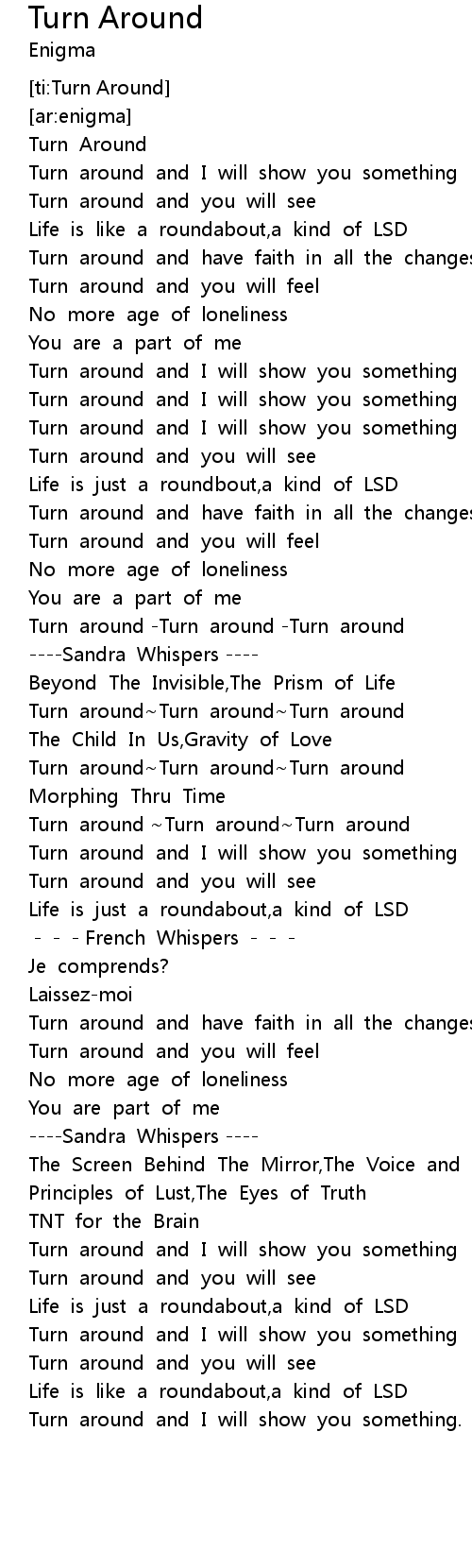 | [01:40.209] | Turn around -Turn around -Turn around |