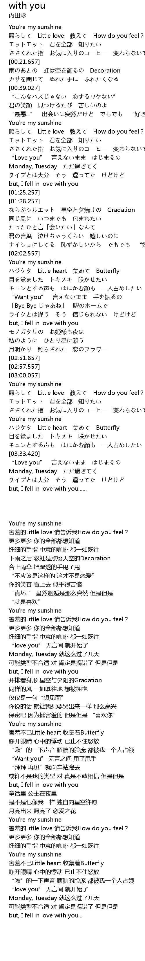 | [00:02.174] | 照らして Little love 教えて How do you feel? |