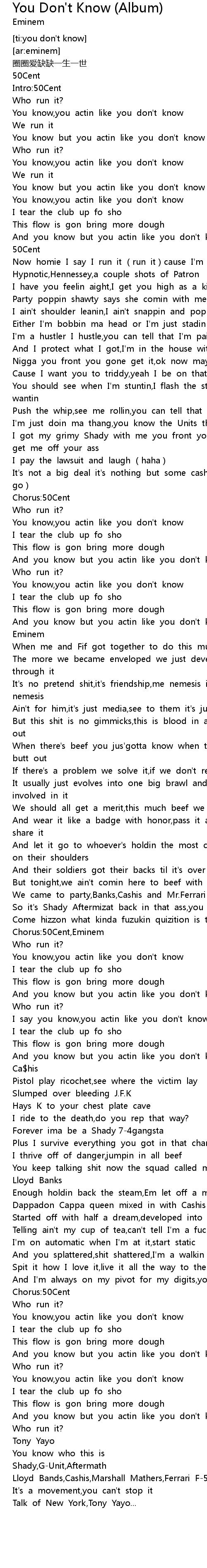 | [03:59.412] | Lloyd Bands,Cashis,Marshall Mathers,Ferrari F-50 |