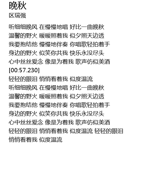 | [00:08.930] | 听细细晚风 在慢慢地唱 好比一曲晚秋 |