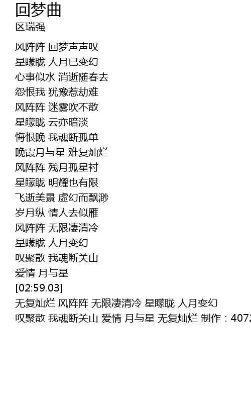 | [02:59.90] | 无复灿烂 风阵阵 无限凄清冷 星矇眬 人月变幻 叹聚散 我魂断关山 爱情 月与星 无复灿烂 制作:407210611 |
