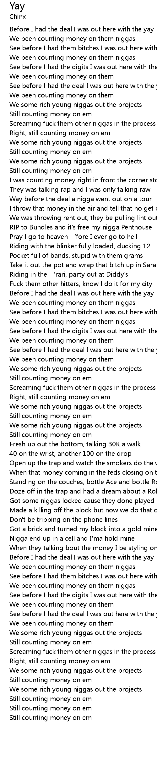 | [00:13.95] | We been counting money on them niggas |
