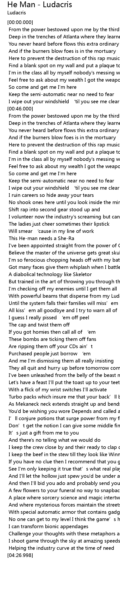 | [02:07.604] | With powerful beams that disperse from my Ludacris-tal balls |