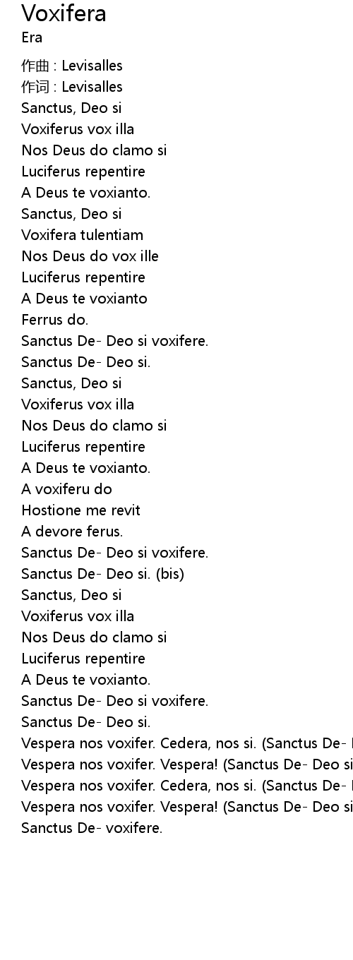 | Vespera nos voxifer. Cedera, nos si. Sanctus De Deo si voxifere. | |