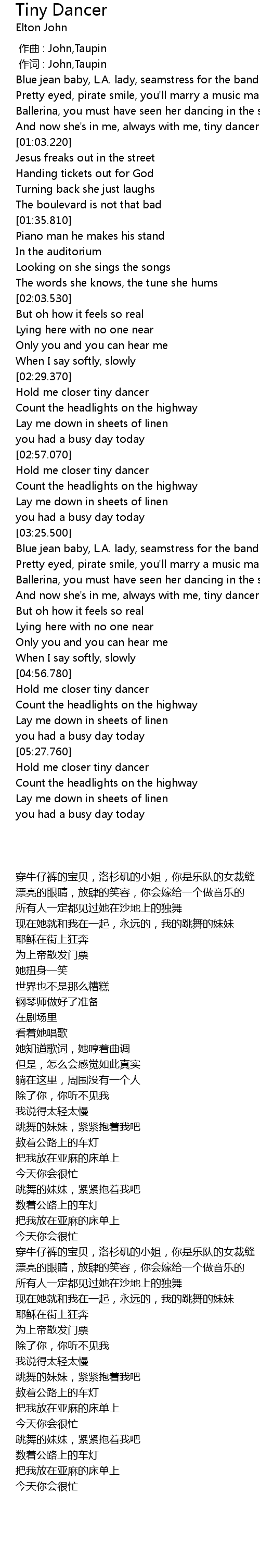 | [00:52.380] | And now she' s in me, always with me, tiny dancer in my hand |