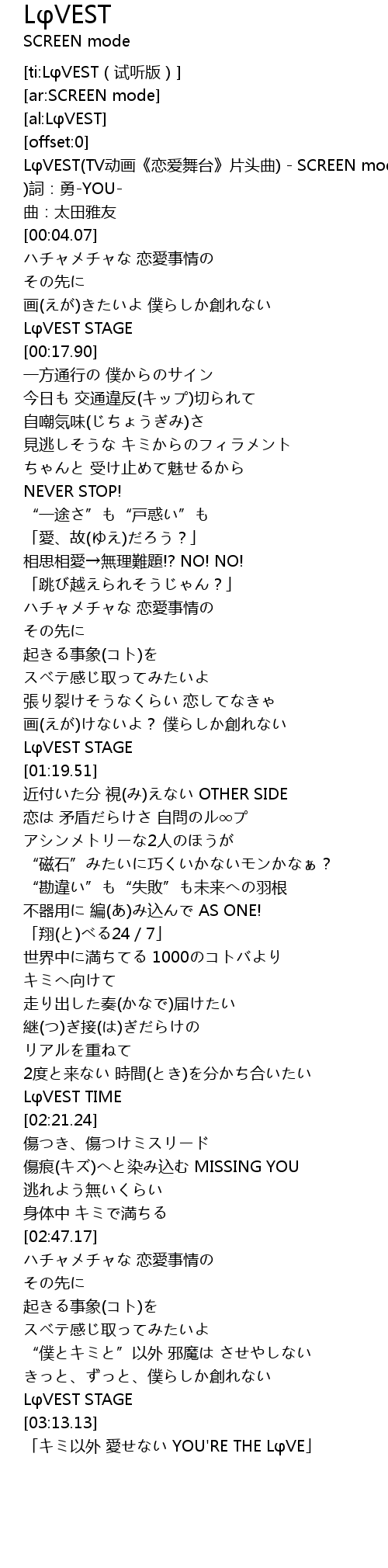 | [00:00.51] | LφVEST(TV动画《恋爱舞台》片头曲) - SCREEN mode |