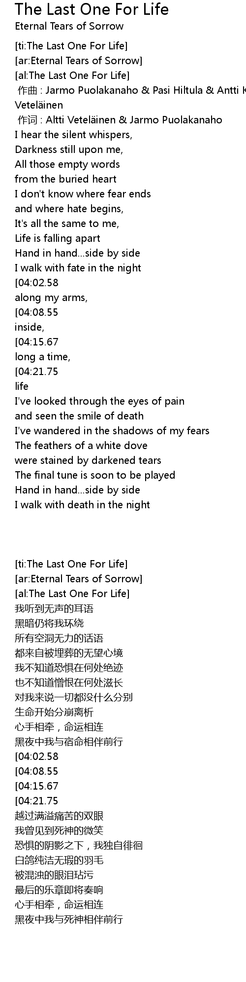| [04:47.89][04:21.75][03:01.13][01:54.53] | when I know the last cut will be for my life |