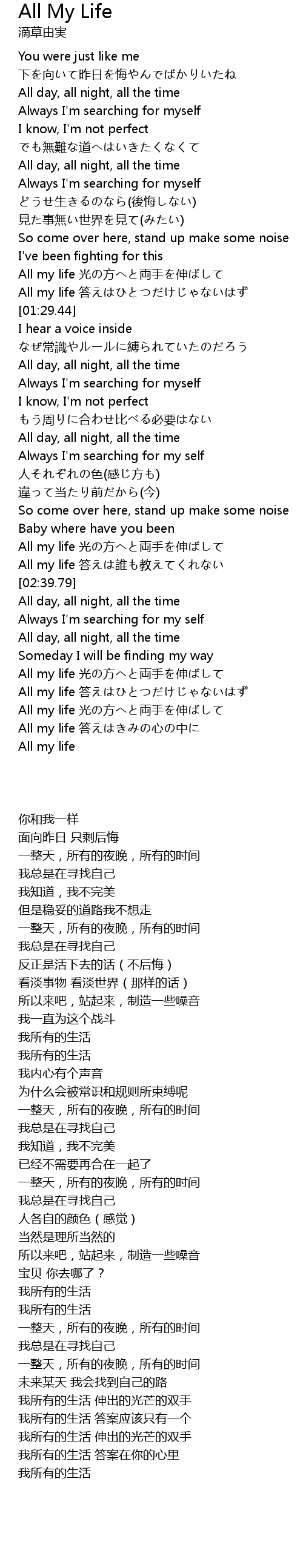| [02:24.22] | All my life 光の方へと両手を伸ばして |
