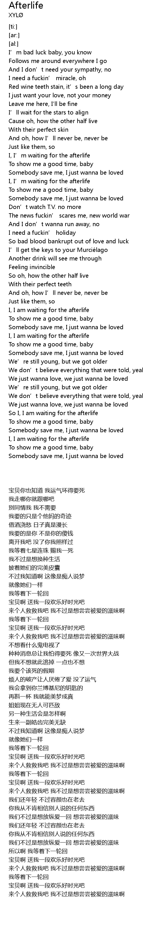 | [02:47.63] | So I, I am waiting for the afterlife |