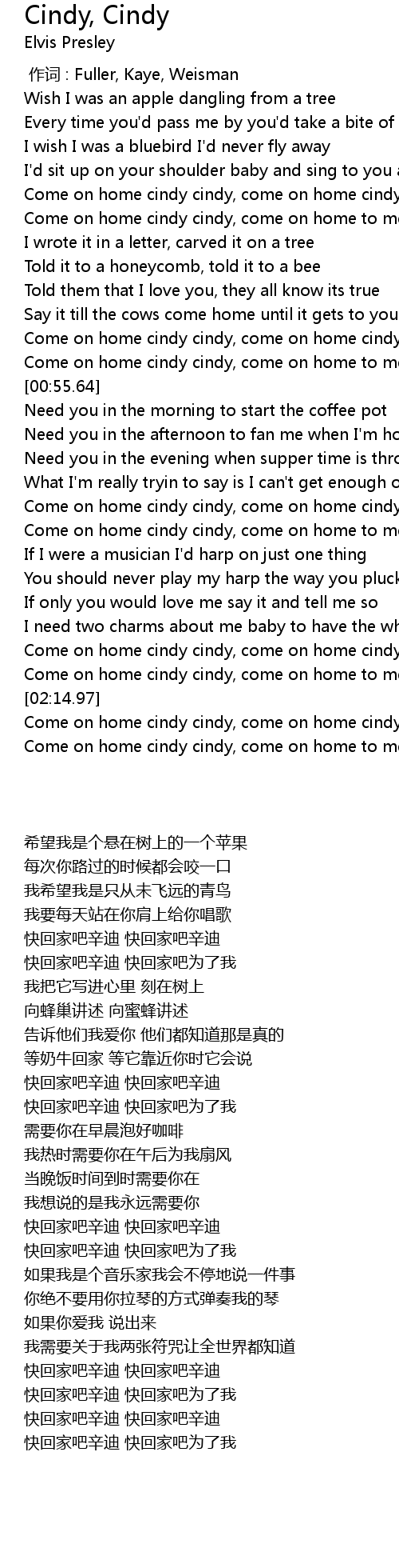 | [02:15.58] | Come on home cindy cindy, come on home cindy cindy |