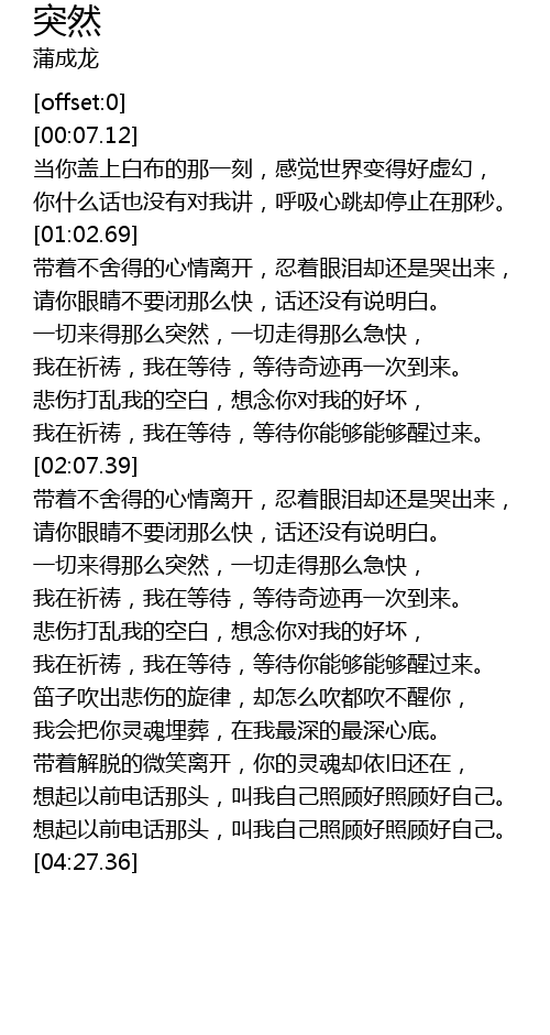 | [03:28.85] | 我在祈祷,我在等待,等待你能够能够醒过来。 |