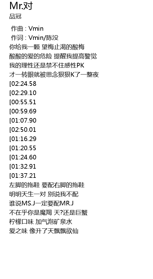 | [03:29.69][02:29.10][00:51.01] | 注定我一定是你的MR.对 |
