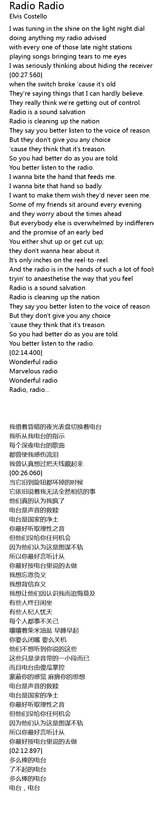 | [02:11.410] | You better listen to the radio. |