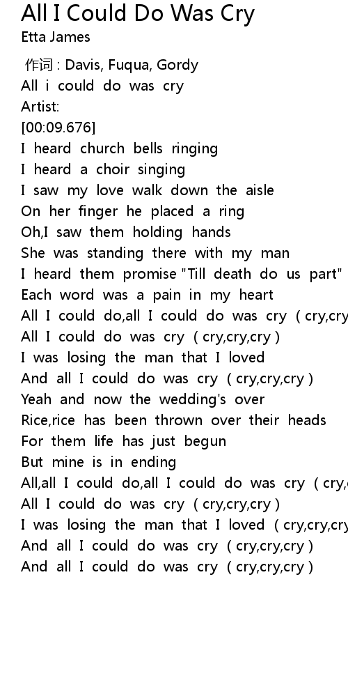| [01:08.227] | All I could do, all I could do was cry cry, cry, cry |