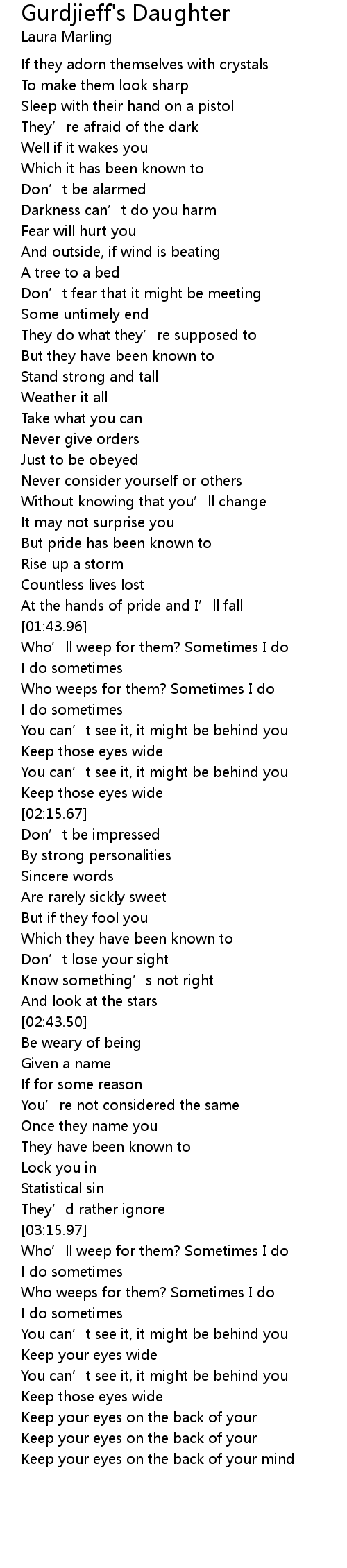 | [03:16.31] | Who' ll weep for them? Sometimes I do |