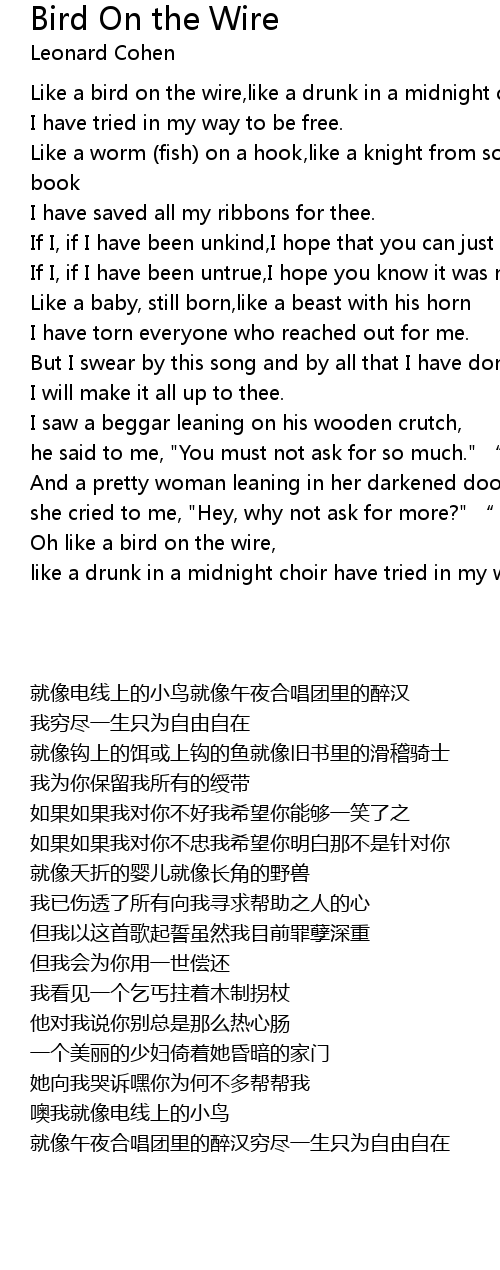 | [00:00.090] | Like a bird on the wire, like a drunk in a midnight choir |