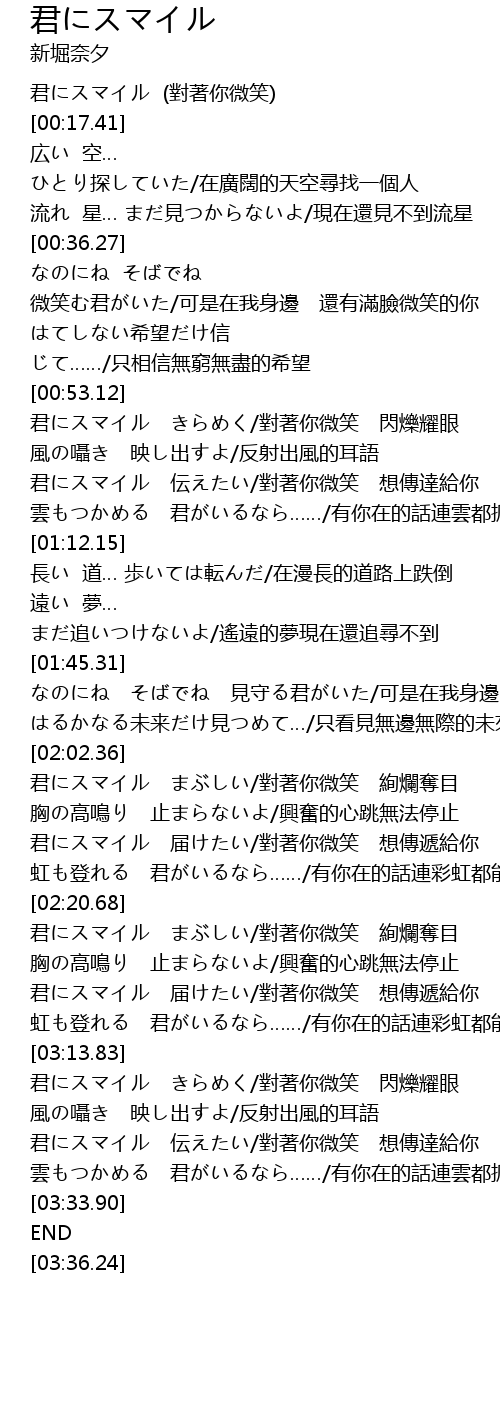 | [03:03.69] | 君にスマイル 届けたい/對著你微笑 想傳遞給你 |
