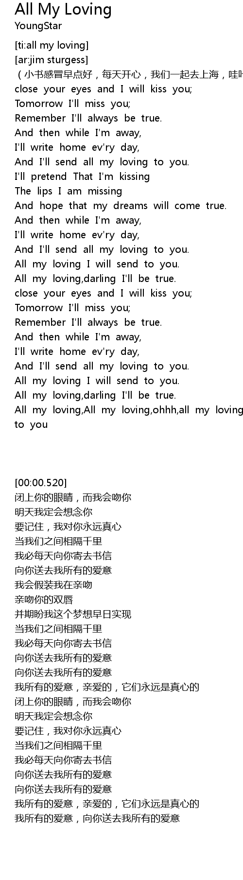 | [02:03.930] | All my loving, All my loving, ohhh, all my loving I will send to you |