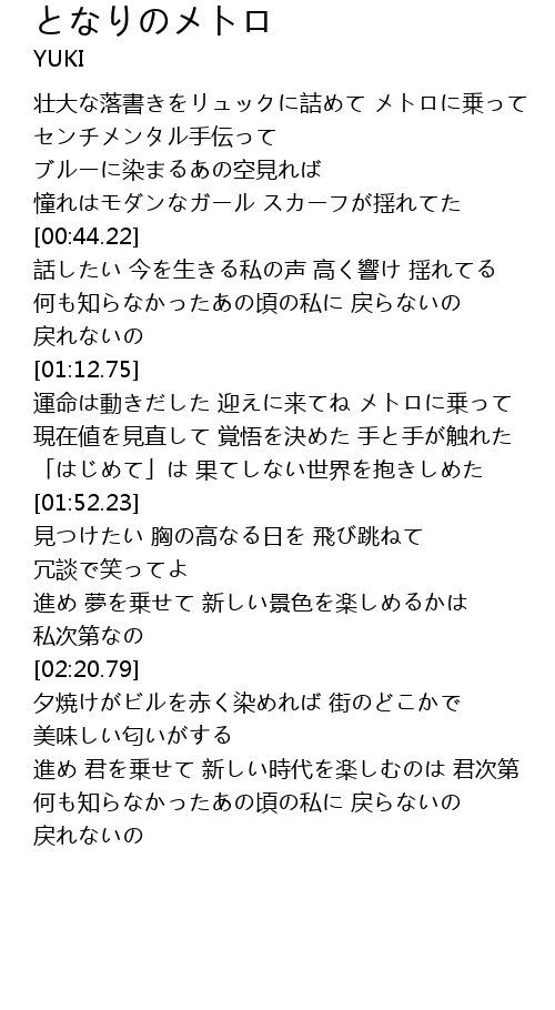 | [01:21.13] | 運命は動きだした 迎えに来てね メトロに乗って |