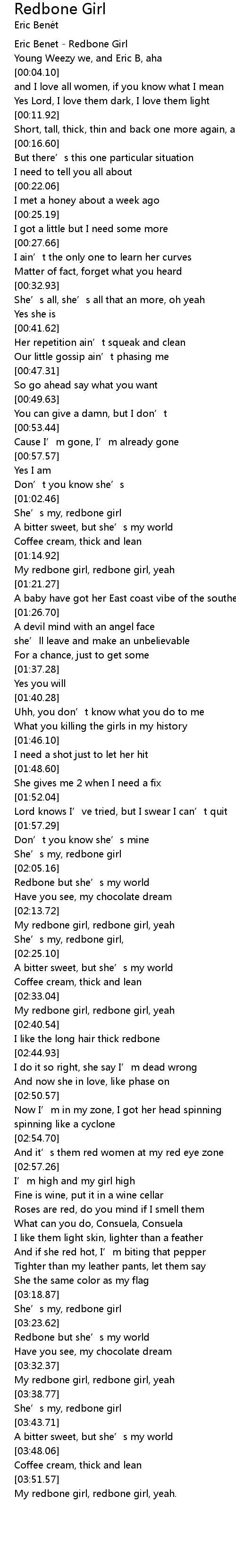 | [03:52.88] | My redbone girl, redbone girl, yeah. |