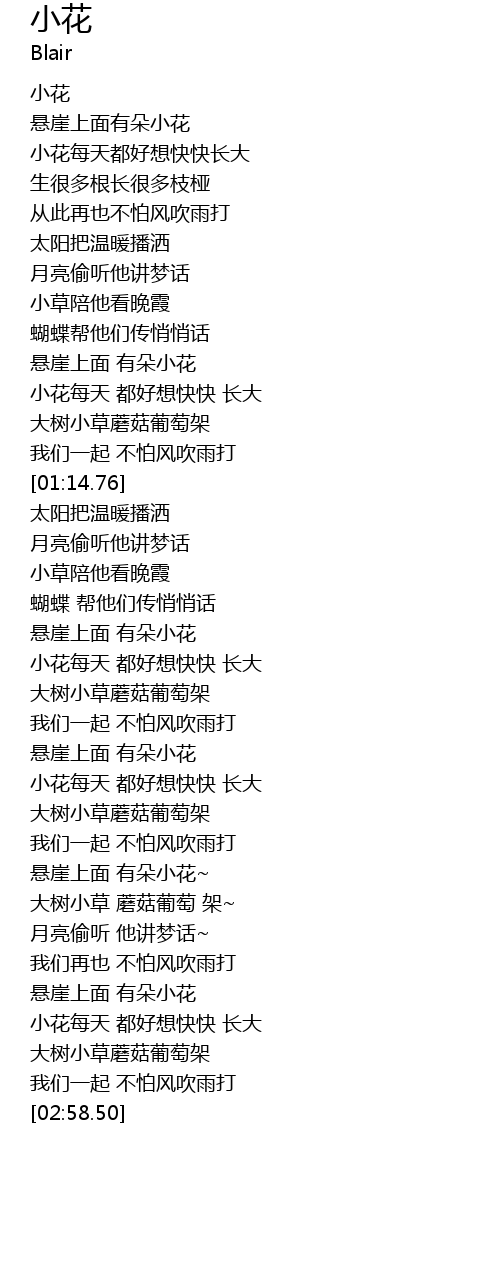 | [02:09.84] | 小花每天 都好想快快 长大 |
