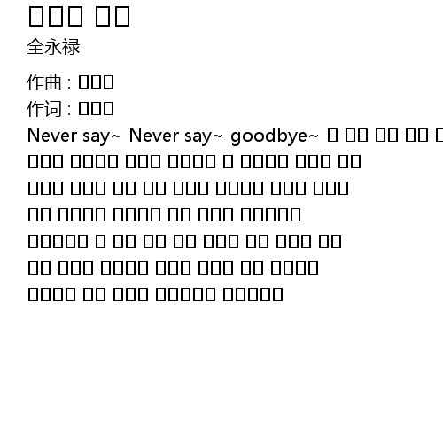 | Never say~ Never say~ goodbye~ 나 세월 지나 너를 잊기로 했네 바람이 불어와도 눈보라 몰아쳐도 나 떠나갈래 추억이 머문 곳으로 희미한 너의 모습 잊혀진 꿈이었나 오늘도 강변에 앉아 그대만을 사랑했던 지난 일들을 떠나보내리 떠나보내리 나 세월 지나 너를 잊기로 했네 한마디 말도 없이 잊혀진 사람인데 오늘도 강변에 앉아 그대만을 사랑했던 지난 일들을 떠나보내리 떠나보내리 |