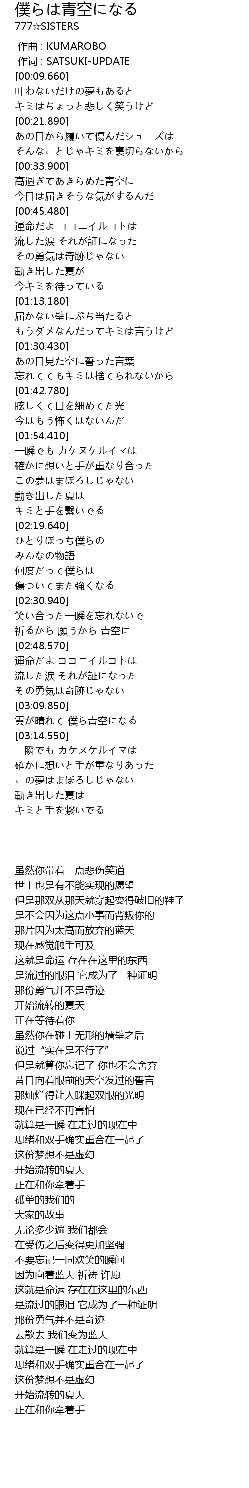 | [03:10.330] | 雲が晴れて 僕ら青空になる |