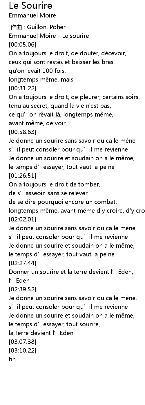 | [00:00.00] | Emmanuel Moire Le sourire |