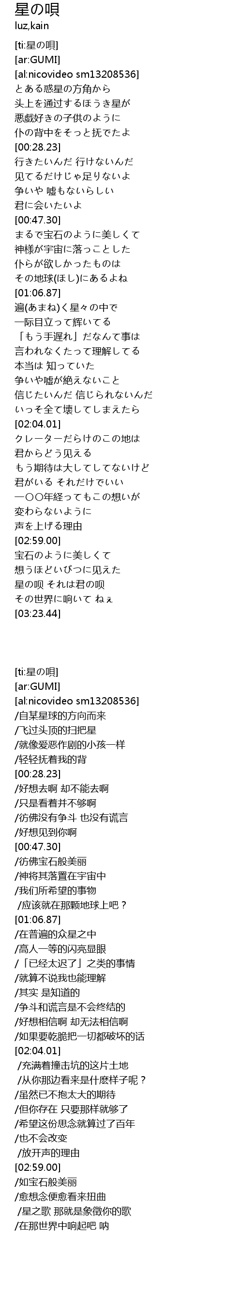 | [00:23.71] | 仆の背中をそっと抚でたよ |