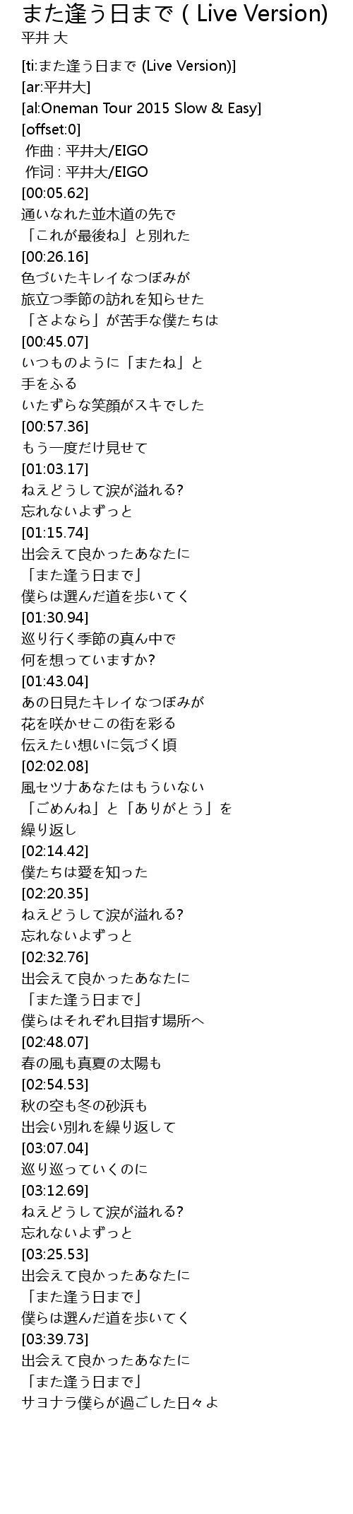 | [00:01.00] | 作词 : 平井大/EIGO |