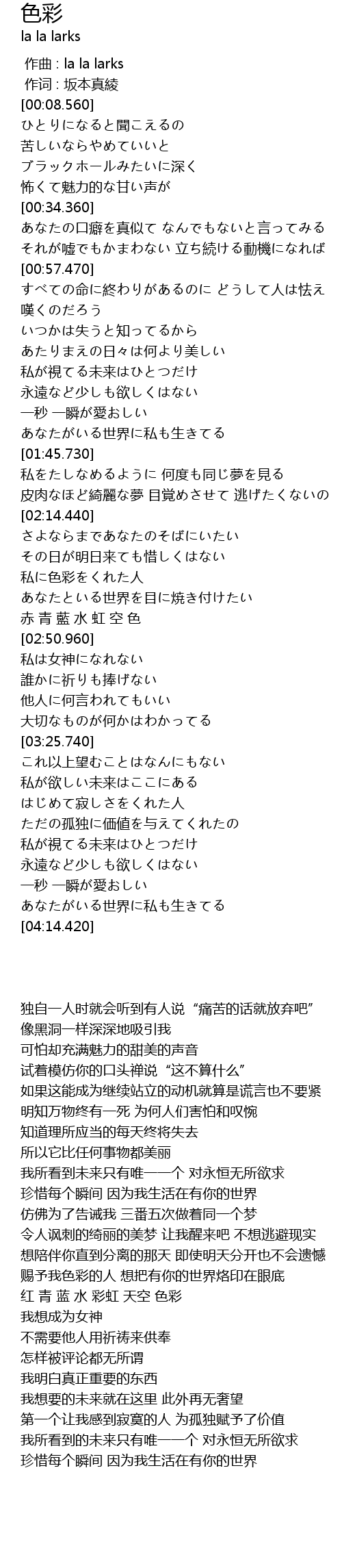 | [02:28.200] | 私に色彩をくれた人 あなたといる世界を目に焼き付けたい |