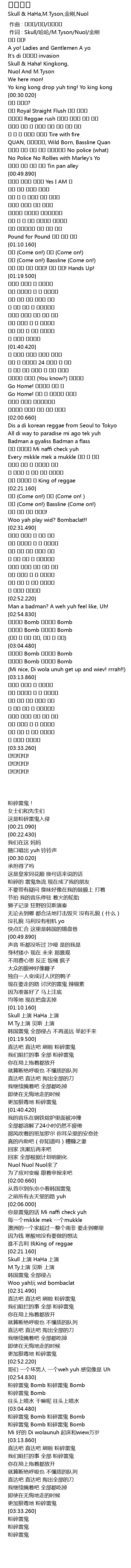 | [00:01.00] | 作词 : Skull/哈哈/M.Tyson/Nuol/金刚 |