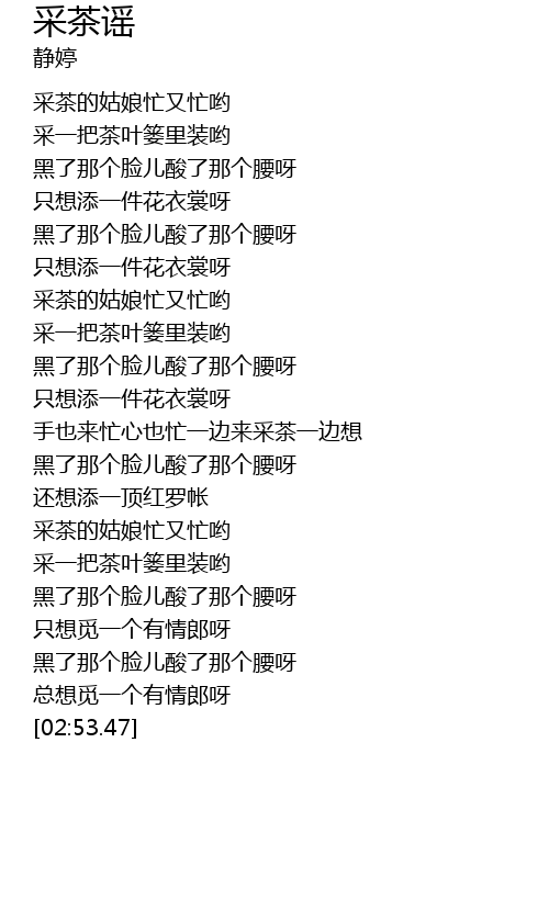 | [00:47.88] | 采茶的姑娘忙又忙哟 |