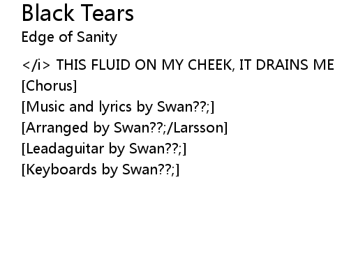 | [Chorus:]</i> THIS FLUID ON MY CHEEK, IT DRAINS ME | |