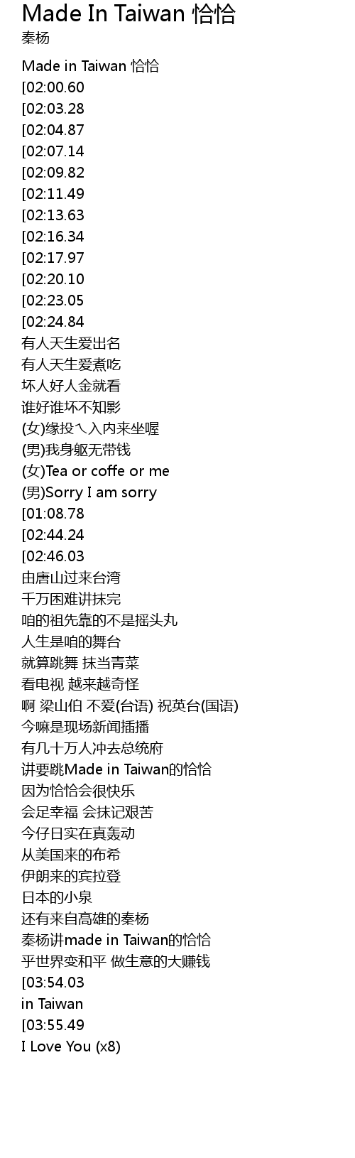 | [00:03.98] | Made in Taiwan 恰恰 |