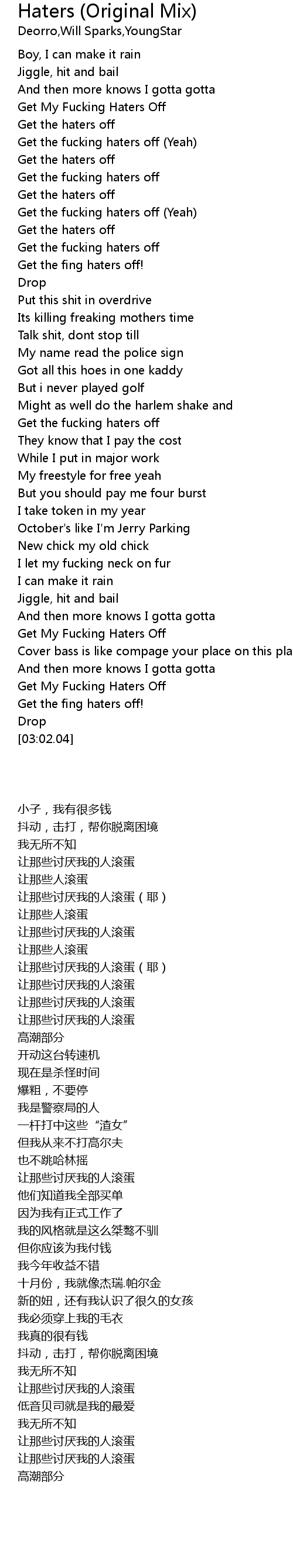 | [00:23.95] | Get the fucking haters off (Yeah) |
