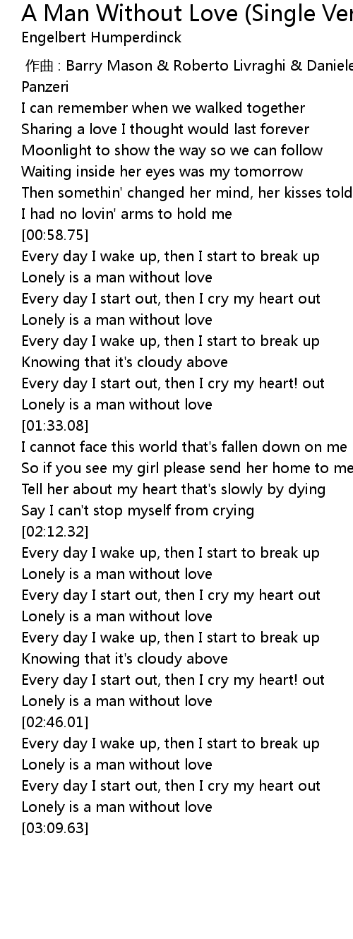 | [00:00.00] | zuò qǔ : Barry Mason Roberto Livraghi Daniele Pace Mario Panzeri |
