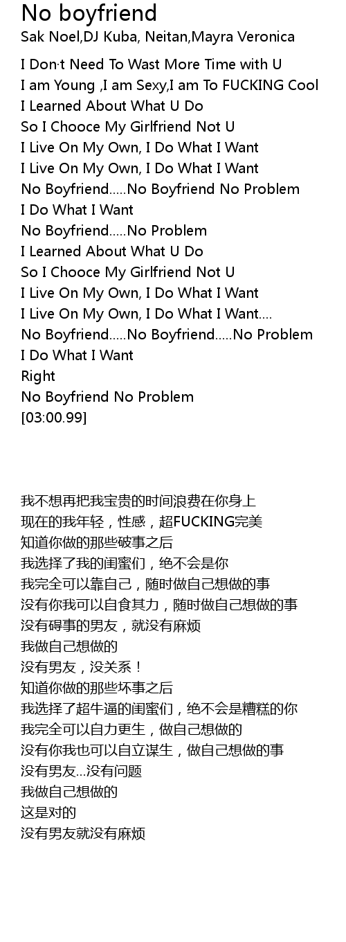 | [00:30.94] | No Boyfriend..... No Boyfriend No Problem |