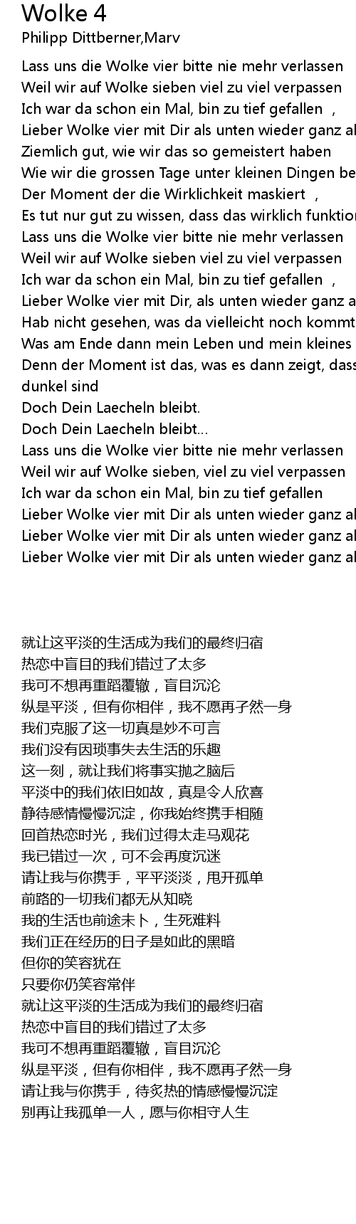 | [00:45.480] | Lieber Wolke vier mit Dir als unten wieder ganz allein , |