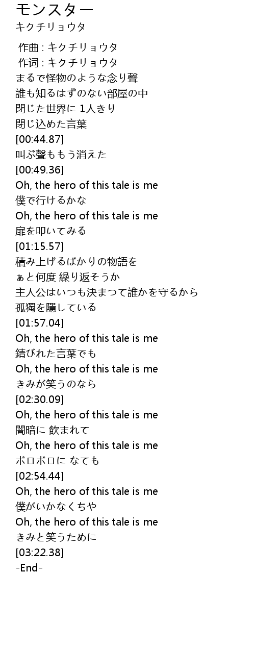 | [03:04.41] | Oh, the hero of this tale is me |