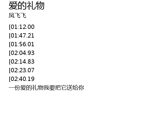 | [00:18.55][01:12.00][02:31.51] | 有一份爱的礼物我要把它送给你 |