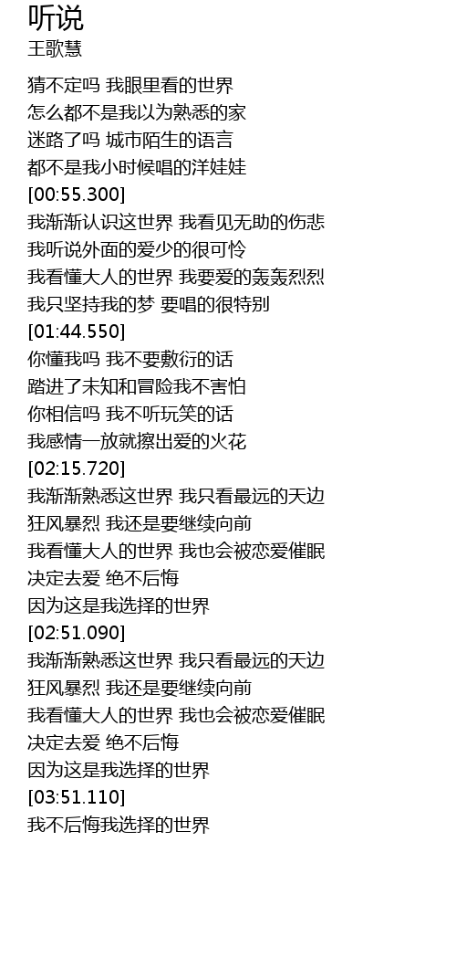 | [03:53.050] | wo bu hou hui wo xuan ze de shi jie |