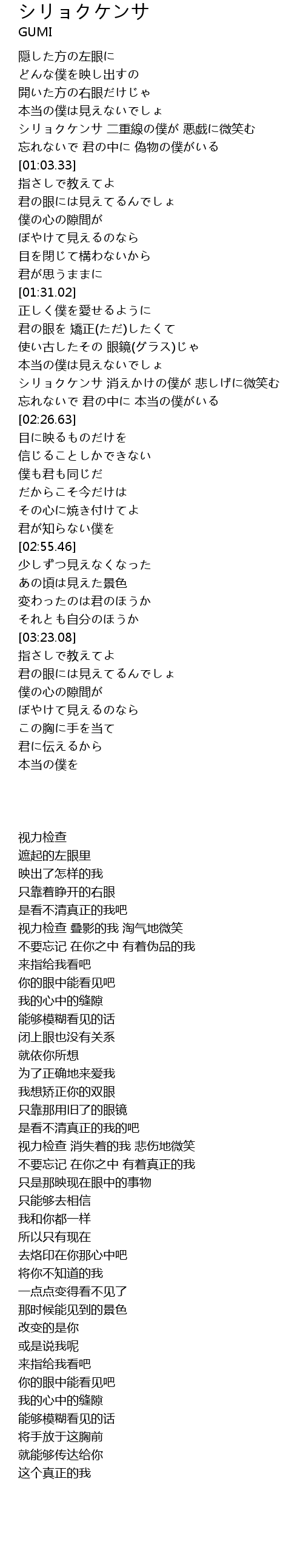 | [00:36.59] | シリョクケンサ 二重線の僕が 悪戯に微笑む |
