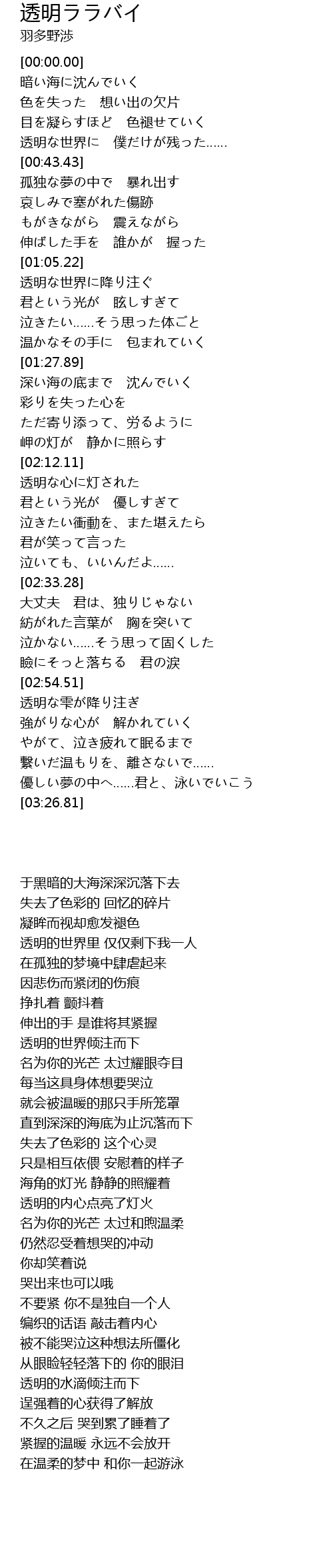 | [00:38.29] | 透明な世界に 僕だけが残った…… |