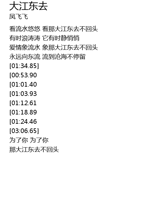 | [00:34.60] | ài qíng xiàng liú shuǐ xiàng nà dà jiāng dōng qù bù huí tóu |