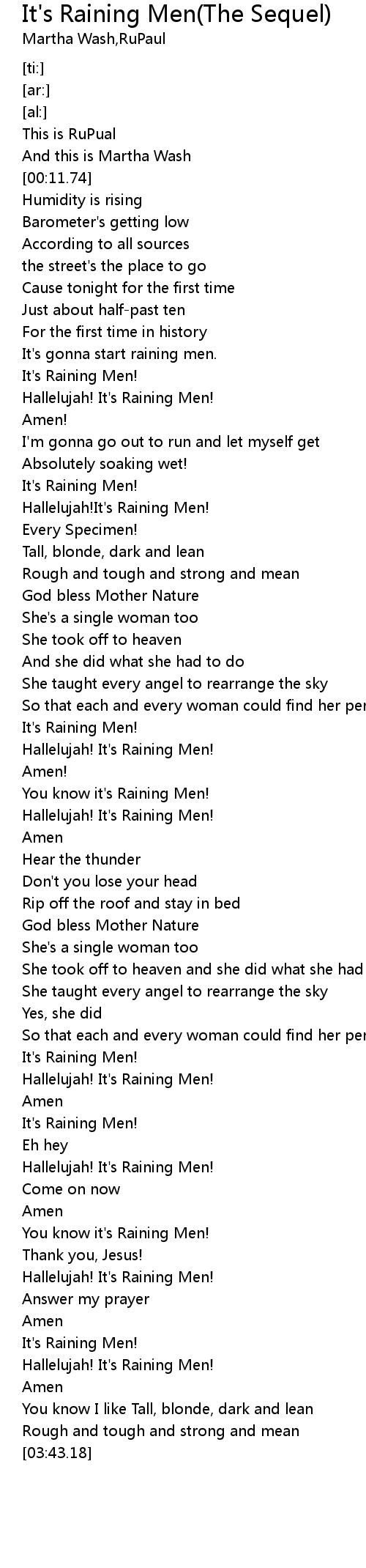 | [03:13.37] | It's Raining Men! |
