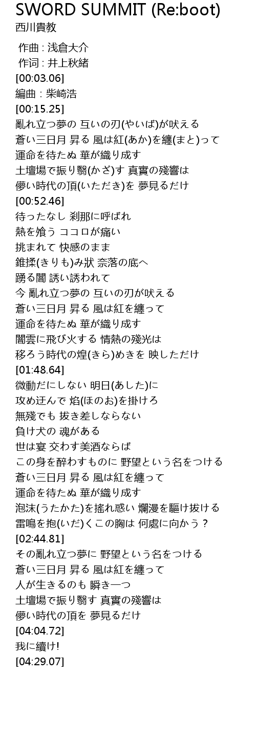 | [02:01.29] | 攻め迂んで 焰(ほのお)を掛けろ |