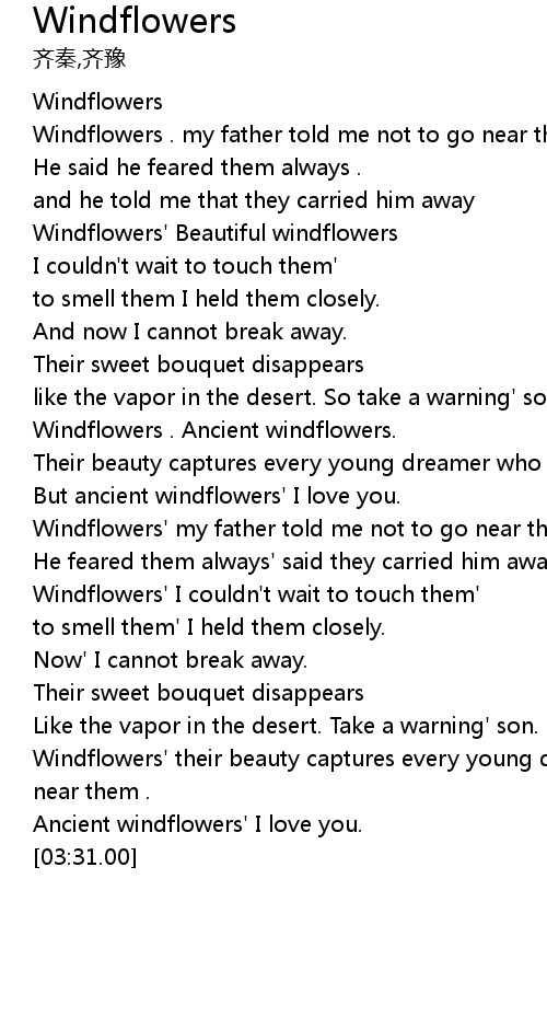 | [03:00.00] | Windflowers' their beauty captures every young dreamer who lingers near them . |